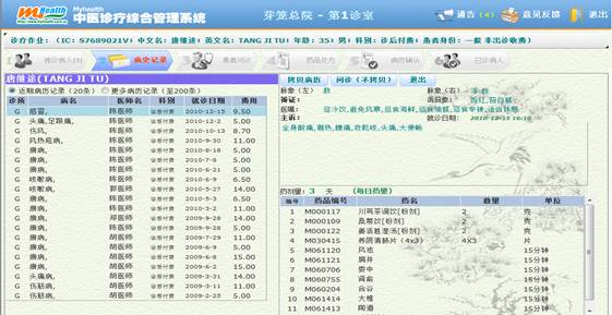 1)诊病功能: 本系统根据中医师诊病的习惯,集病人登记、病历记录、药品处方、诊费计算及病人取药等全部过程为一体,界面清楚、操作方便。