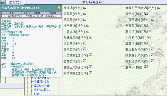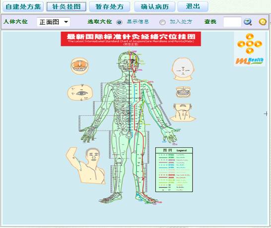 4)参考资料:本系统内置有根据中国国家中医病症的分类标准而提供的病名、辨证参考;包括常见病症的辨证、证状、治疗及常用处方的功效、组成等资料;系统还提供国际标准针灸经络穴位图,对穴位进行定位及说明;另外,系统还提供有医师自建主诉及处方集,方便医师在诊病时应用。